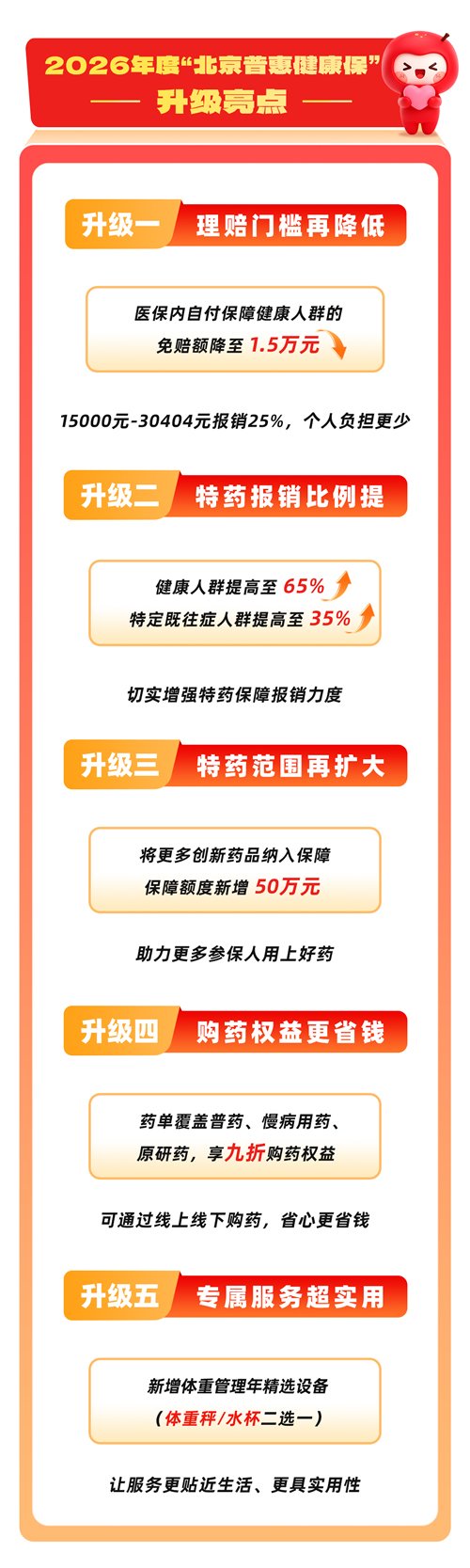 2026年度“北京普惠健康保”继续秉持“普惠利民”初心,保费仍维持195元/人/年,累计保额升级至350万元,保障全面升级,每一项升级都精准响应市民需求,让“普惠”的温度传递到更多家庭。
